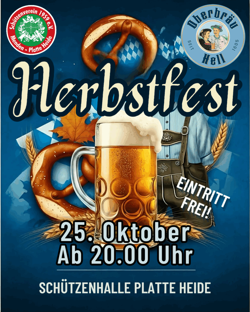 Das Herbstfest des Schützenvereins 1959 Menden – Platte Heide verspricht eine unvergessliche Nacht mit gutem Essen, fröhlichen Gesprächen, bayrischer Lebensfreude und erstklassiger musikalischer Begleitung zu werden. Seien Sie Teil dieser besonderen Veranstaltung und genießen Sie einen Abend, der die bayerische Kultur und Gastfreundschaft zelebriert.