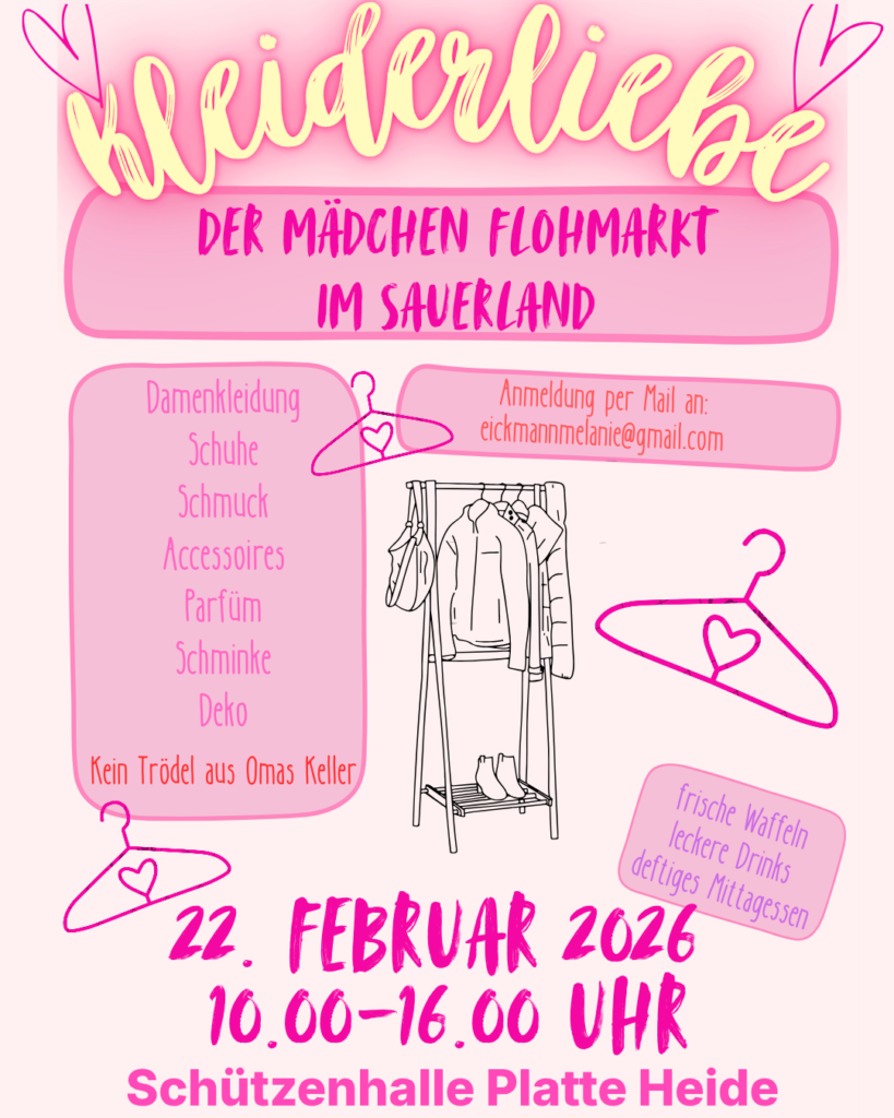 ​Es ist wieder soweit, Platz im Kleiderschrank zu schaffen oder neue Lieblingsteile zu ergattern. Wir laden euch herzlich ein zum Mädchen Flohmarkt „Kleiderliebe“ in der Schützenhalle Platte Heide! 🛍️✨